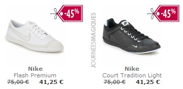 Parmi les soldes chaussures qu’on a choisi pour vous pendant les soldes Spartoo, on a choisi deux modèles à -45%, le modèle blanc de la Nike Flash premium, qui est à 41,25€ et le modèle court tradition light qui est un modèle tennis rétro, conçu initialement pour les joueurs du ballon jaune.