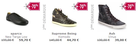 Les chaussures soldés à – 70% ne sont pas nombreuses (16 seulement), mais la remise moyenne sur les chaussures est de l’ordre de 40 à 50 %. Voici un aperçu des baskets que vous pouvez trouver :